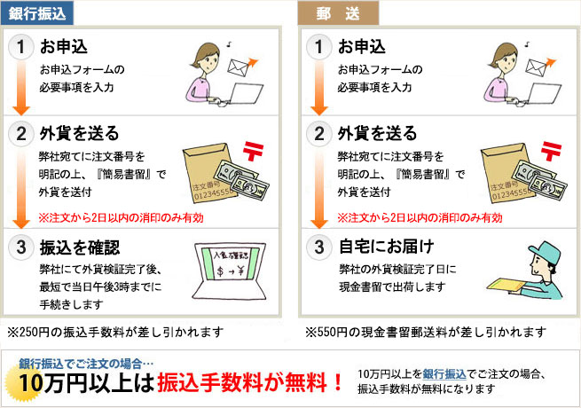 ※ when you send your foreign currency, the postmark deadline has to be within two days after you order, or we would apply an exchange rate of the date we received it.