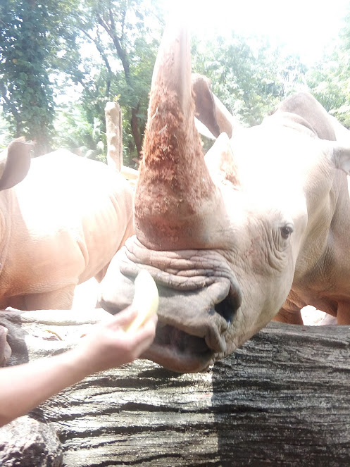 飼育員さんによると、白サイには歯が無いので、手を入れても危なくはないそうです。(手はベタベタになりますが...笑)