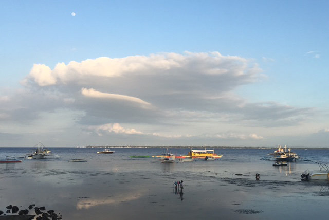 | フィリピンで滞在したホテルの前の海です。大潮で潮が大きく引いているところに、現地の人が貝や魚を獲るために海に出ています。 |