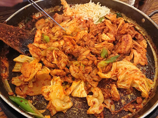 | 人気店のタッカルビ。辛いんですが、箸が進みます。少し残ったタッカルビとご飯を混ぜてのチャーハンは最高でした! |