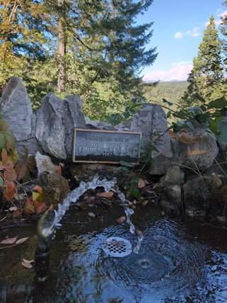 | ヘッジクリークフォールズにある水飲み場。散策で乾いた喉を潤し疲れ癒す。後方にはシャスタ山。 |